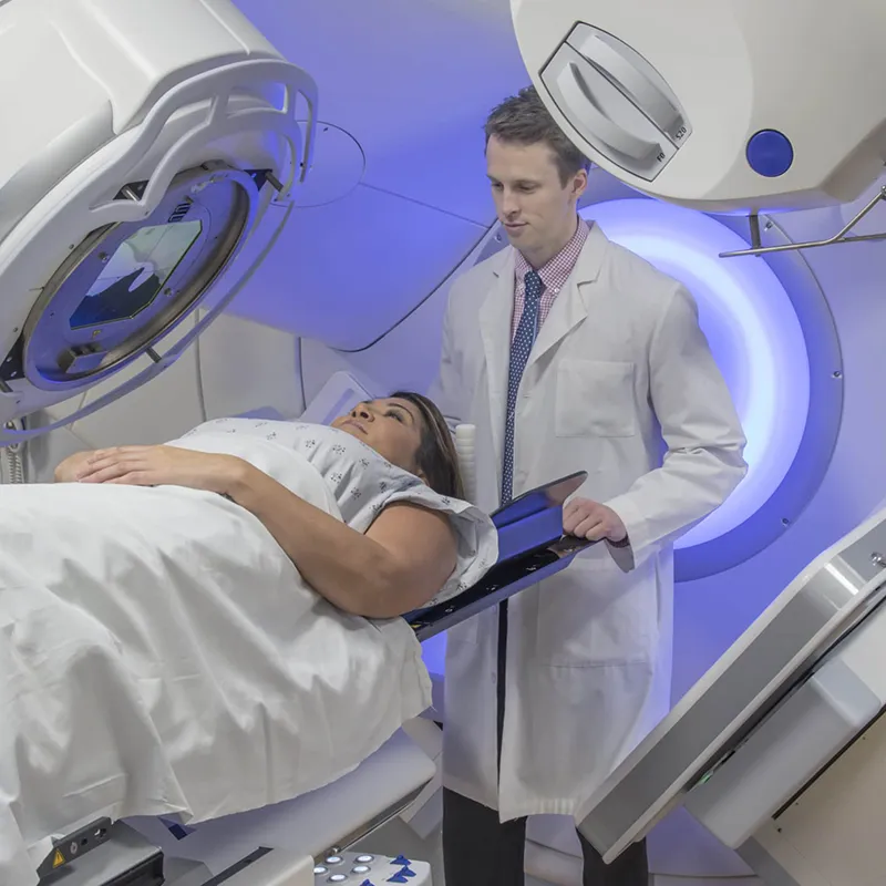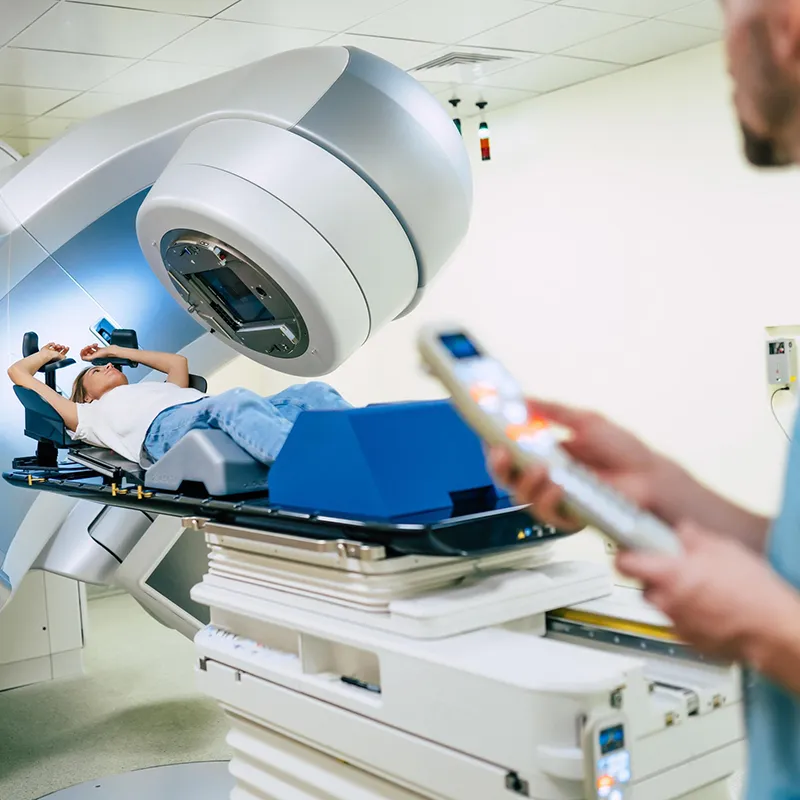 آماده‌سازی برای درمان: بیمار روی تخت در وضعیت ثابت قرار می‌گیرد تا دستگاه به‌درستی تنظیم شود.